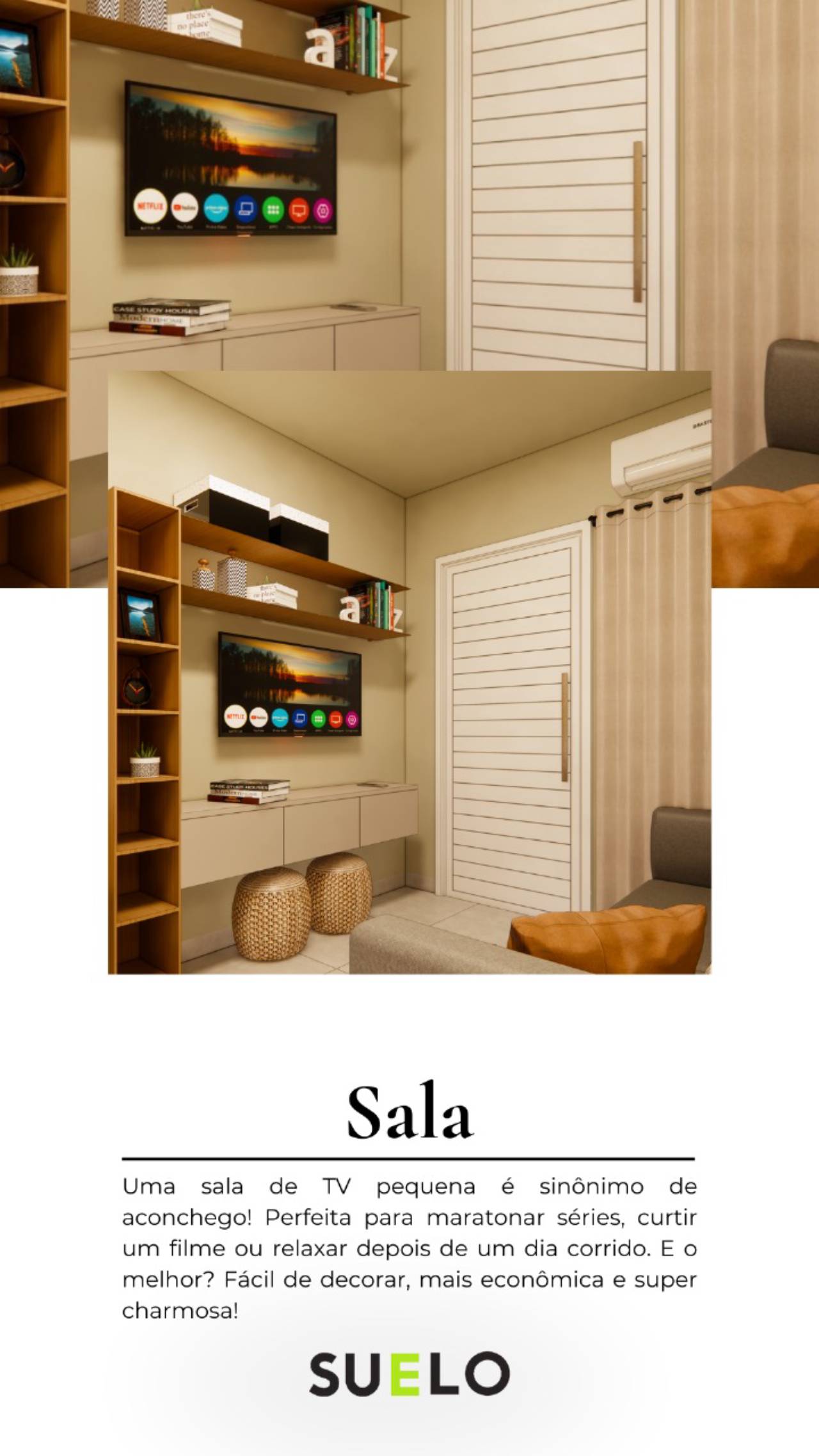 A sala de TV, com tamanho ideal, é perfeita para maratonar séries, curtir um bom filme ou simplesmente relaxar após um dia agitado. Fácil de decorar, charmosa e com aquele toque de lar que conquista logo de cara.