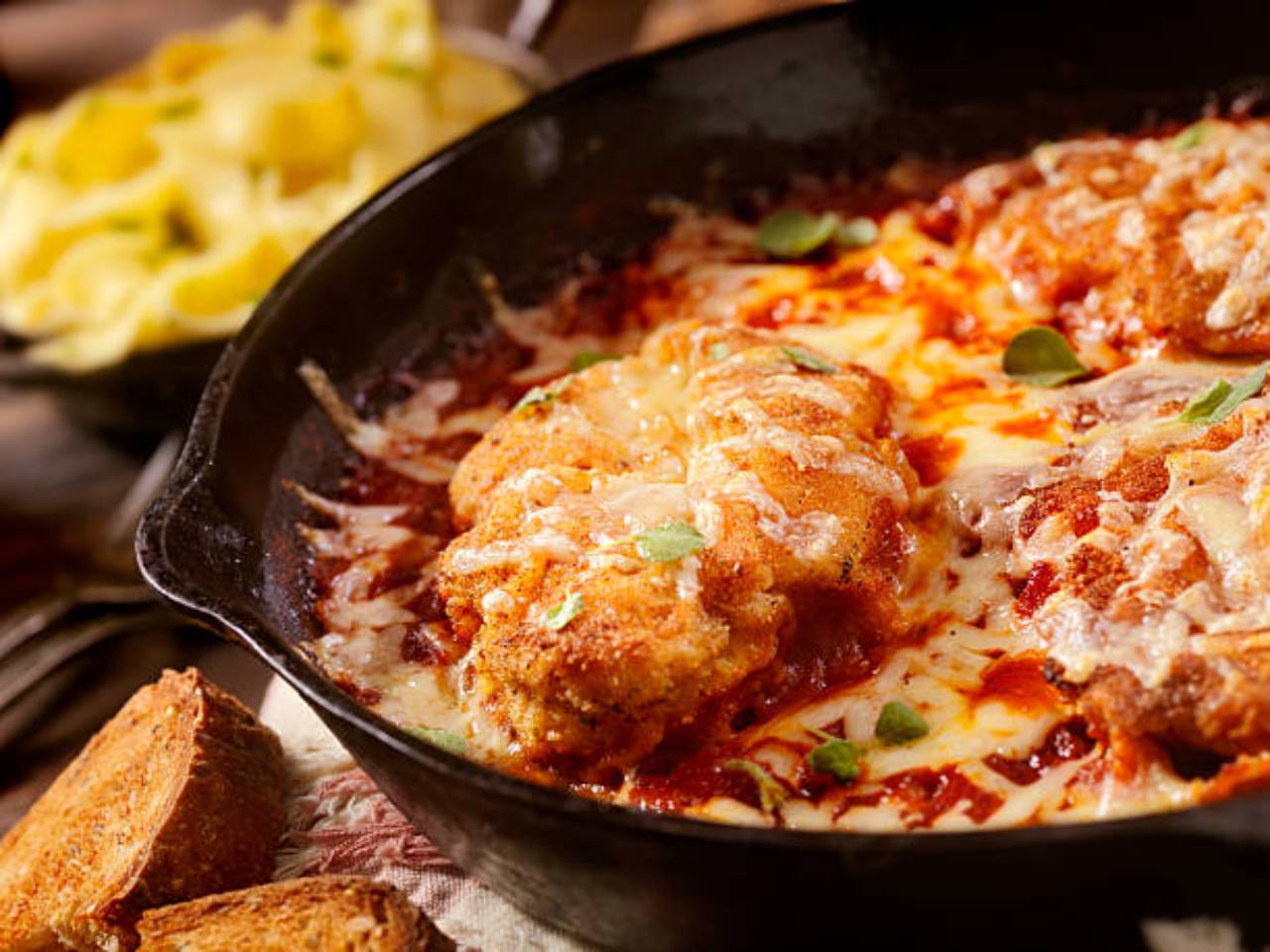 - Prato principal: Dois filés de frango empanados, molho de tomate caseiro e queijo derretido