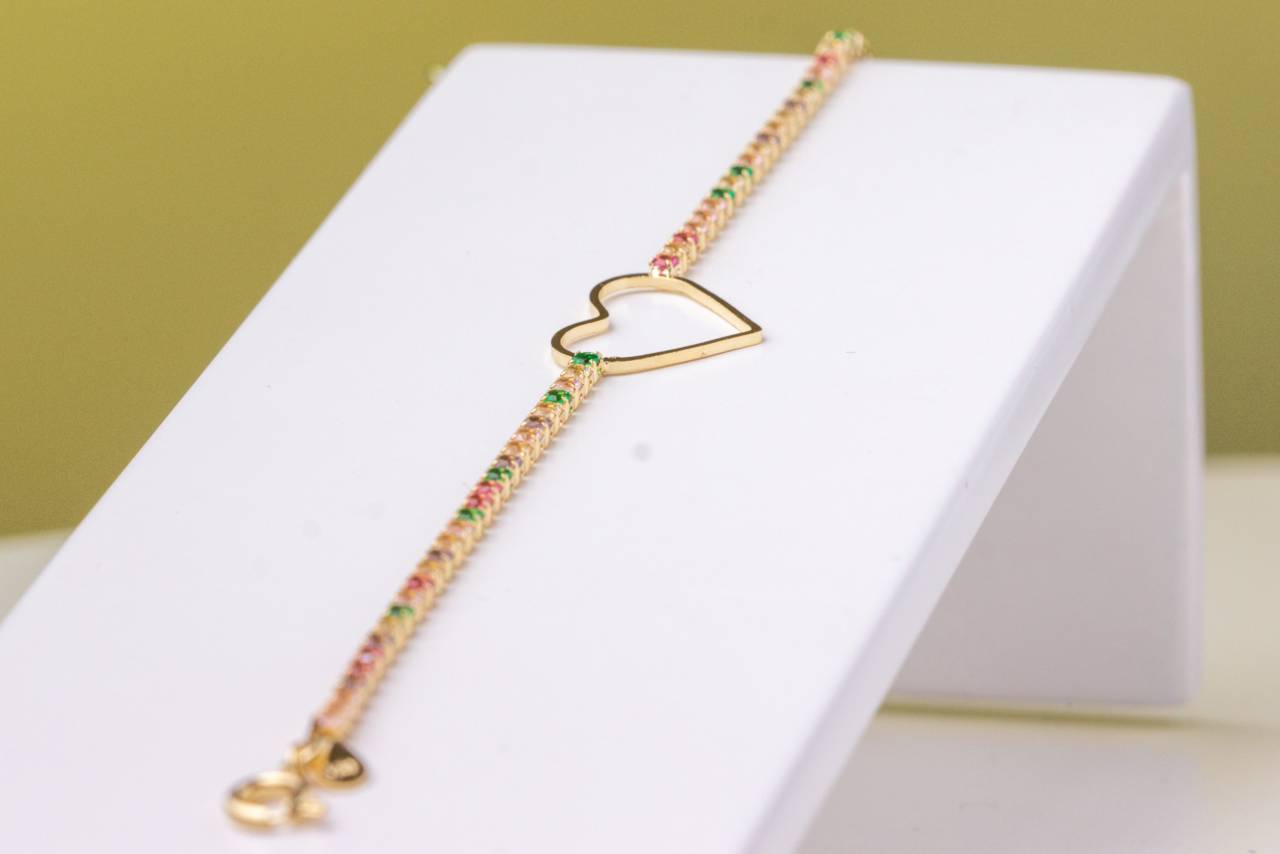 Pulseira com Coração Vazado e Zircônias Coloridas – Elegância e Estilo em São Manuel