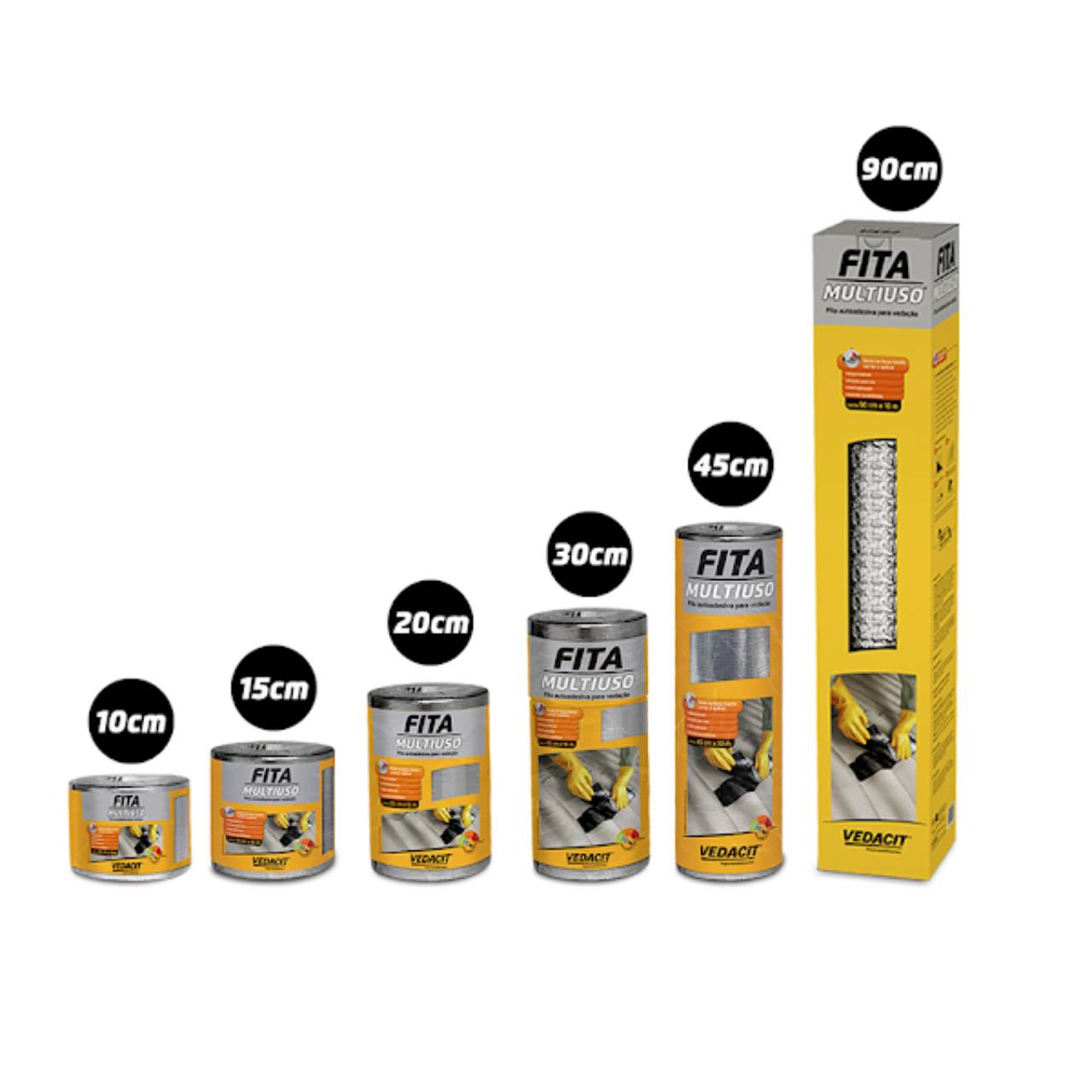 A FITA MULTIUSO AUTOADESIVA VEDACIT é uma fita asfáltica impermeável, produzida à base de asfaltos modificados com polímeros e elastômeros, que apresenta excelente aderência a vários substratos. Possui estruturante não tecido resinado de poliéster que confere maior resistência e flexibilidade. A cobertura superficial de alumínio atua como barreira refletora dos raios solares e apresenta grande durabilidade. É de fácil aplicação, sendo um modo prático, rápido e eficaz de vedar imediatamente goteiras e infiltrações. Rendimento: Rolo 10 cm x 10 m: 1m² Rolo 15 cm x 10 m: 1,5m² Rolo 20 cm x 10 m: 2m² Rolo 30 cm x 10 m: 3m² Rolo 45 cm x 10 m: 1,5m² Rolo 90 cm x 10 m: 9m²