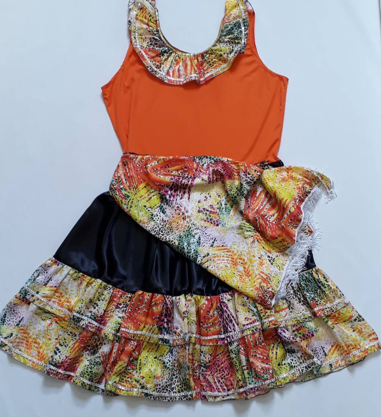 Blusa em helanca, com babado em cetim, aplique em lantejoula e galão metalizado. Saia em cetim, com babados, acabamento em fio metalizado e aplique em galão.