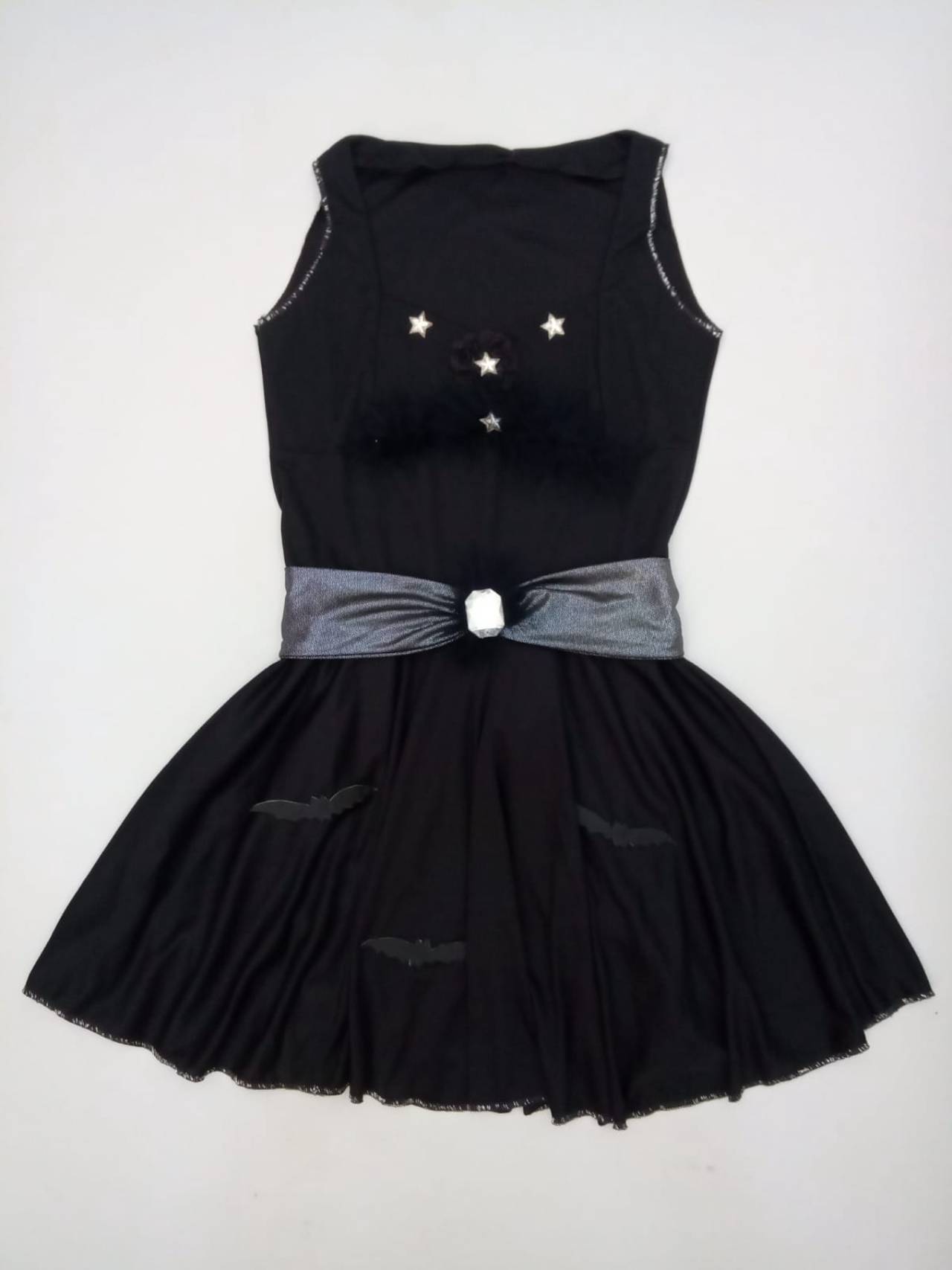 Feito em helanca, possui detalhes de morcegos na saia e aplique de marabú e estrelas na blusa.