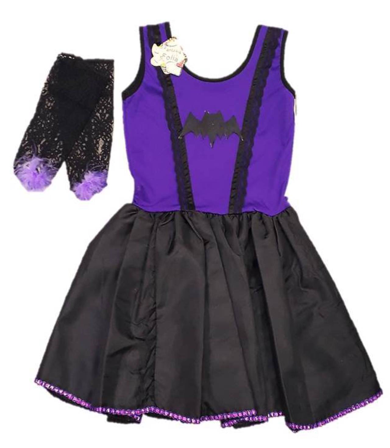 Blusa em helanca, com aplique de morceguinho e renda. Saia em bember com acabamento em galão metalizado.