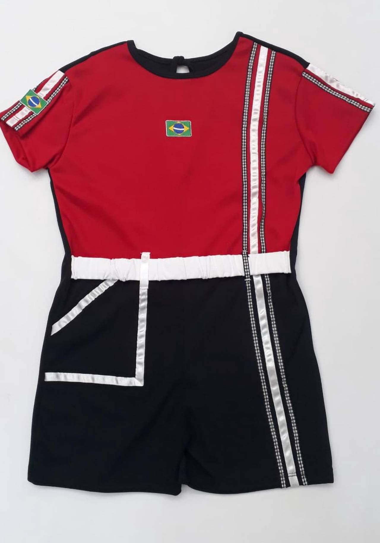 Feito em helanca, possui amarração nas costas, cinto preso nas laterias e apliques em fita de cetim.