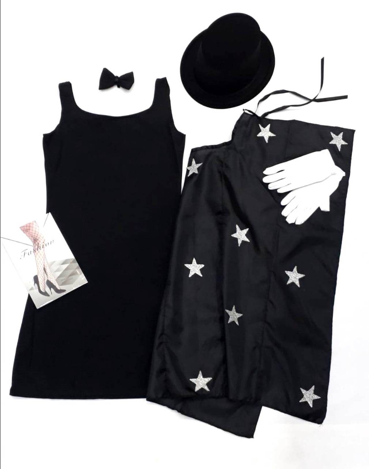 Vestido tipo tubinho em helanca. Capa em bember com apliques de estrelas em glotter.