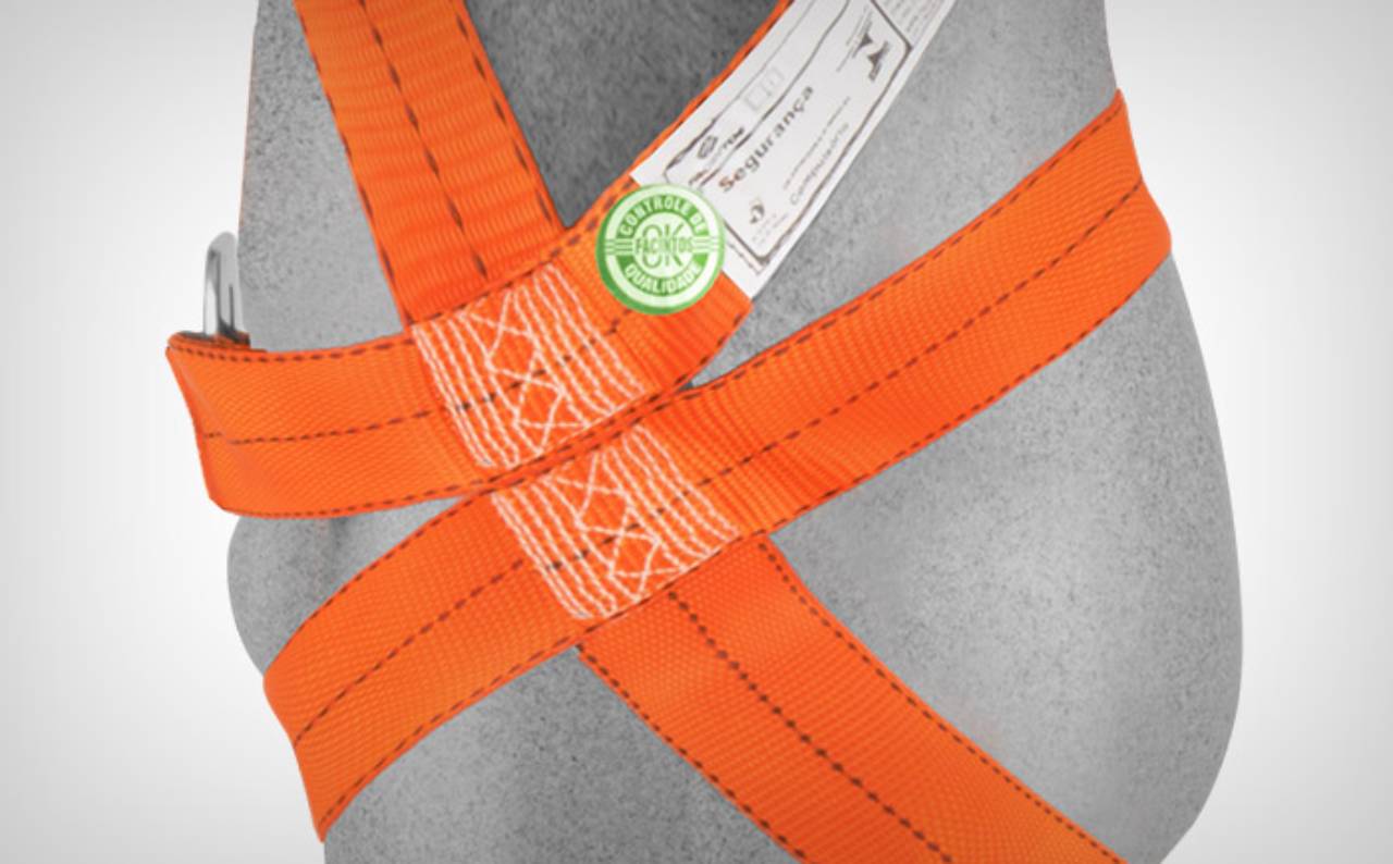 Cinto para-quedista em fita de poliéster, possui 1 argola dorsal em "D" para retenção de quedas.