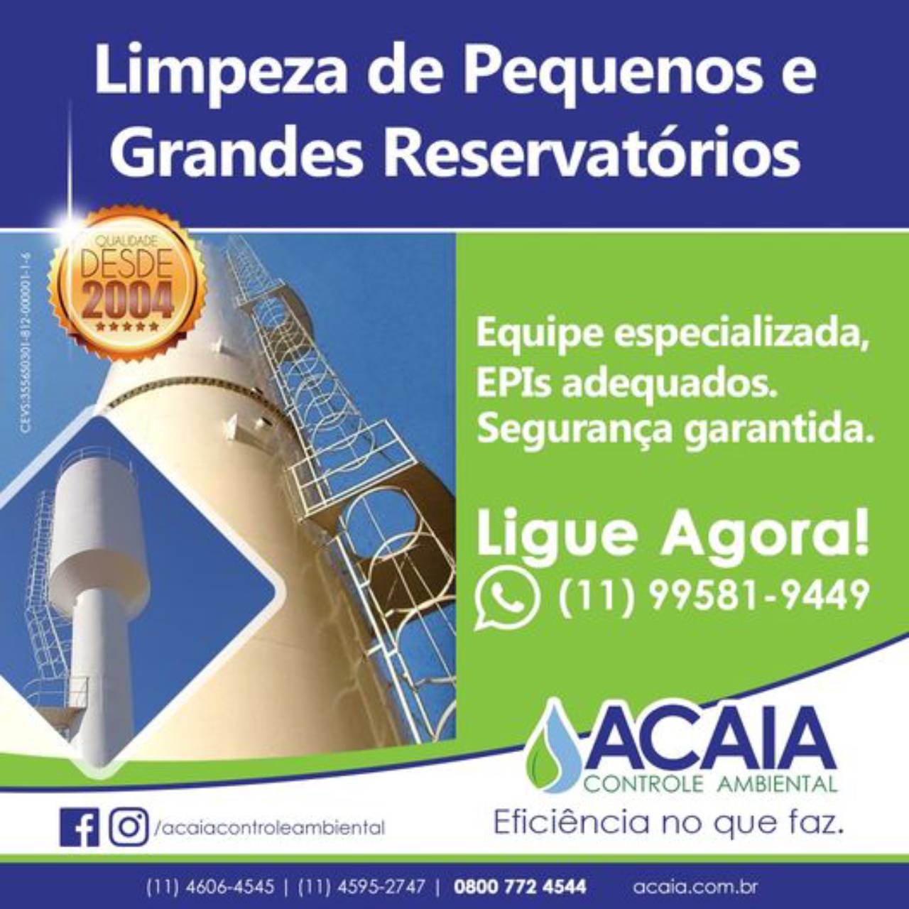 Importância da limpeza da caixa d’água A qualidade da água depende da higiene, para que isso seja possível, o reservatório de água deve estar limpo, desinfectado e em boas condições de armazenamento. Caso contrário à água pode ficar contaminada por microrganismos e causar sérias doenças. Somos especializados na prestação de serviços de limpeza de reservatórios/ caixas d’água de pequenas e grandes capacidades. Profissionais treinados, equipamentos de última geração, atendendo as normas da CETESB, orientações da ANVISA, NBR 5626 e das NR 33 e NR35, preservando a qualidade e segurança de nossos, colaboradores.