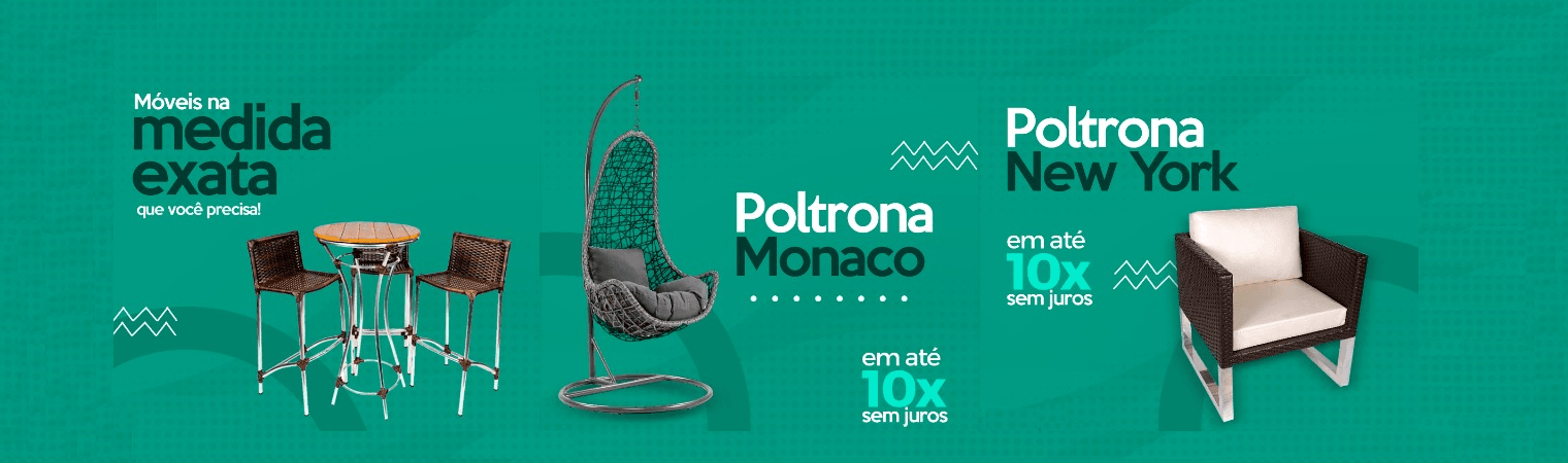 Aparadores, banquetas, espreguiçadeiras, cadeiras, jogos de mesa, jogos de área, poltronas, jogos de sofás, namoradeiras, chaises, balanços, vasos, ombrelones, brinquedos, gazebos, entre outros.