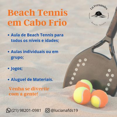 Lu Fernandes Beach Tennis oferece tudo necessário para a prática do esporte, além disso, contamos com um currículo vasto em conhecimento, tais como: convocada por 3 anos seguidos para participar do Panamericano de Beach Tennis, Vice Campeã de simples no SulAméricano de Praia - Vargas - Venezuela 2014, entrei para o ranking de 34° do mundo e ranking de 6° do Brasil, participação de muitos campeonatos pelo Brasil, alcançando o pódio em alguns deles e, já joguei em Aruba - um dos lugares mais paradisíacos do mundo. Hoje me dedico em ministrar aulas de Beach Tennis com muito porfissionalismo e diversão para todos os níveis de idade, além disso, também alugo material e jogos.