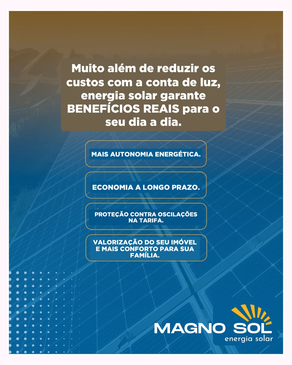 Diferenciais Magno SolNosso maior diferencial é a qualidade no atendimento e a confiança conquistada junto aos nossos clientes. Trabalhamos com transparência, soluções sob medida e suporte técnico completo. Cada projeto é planejado para entregar eficiência energética e retorno real no investimento, respeitando as necessidades de cada consumidor em Niterói e em outras regiões do país.