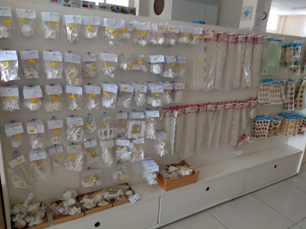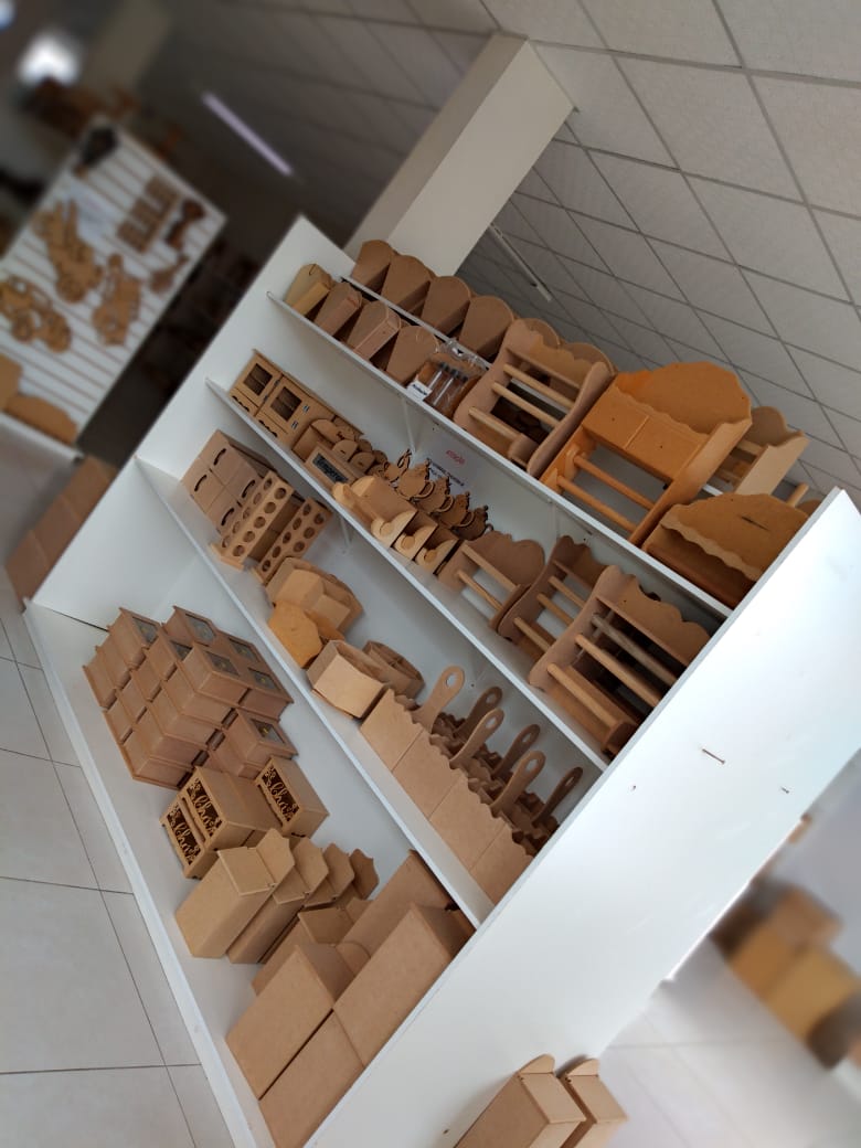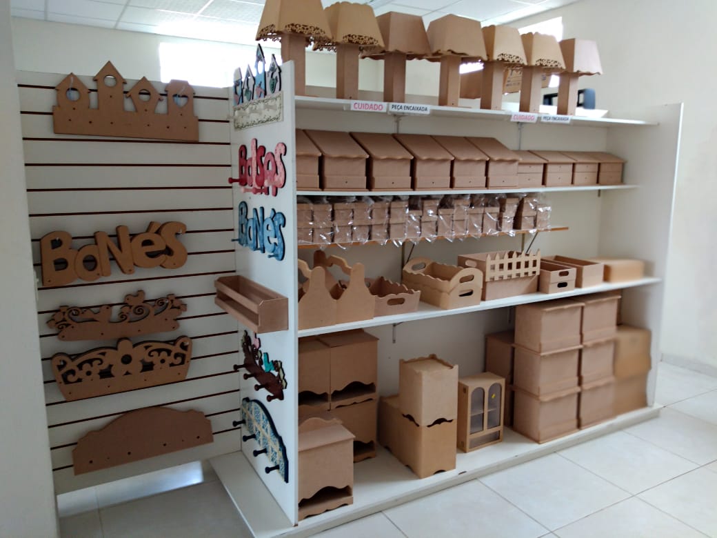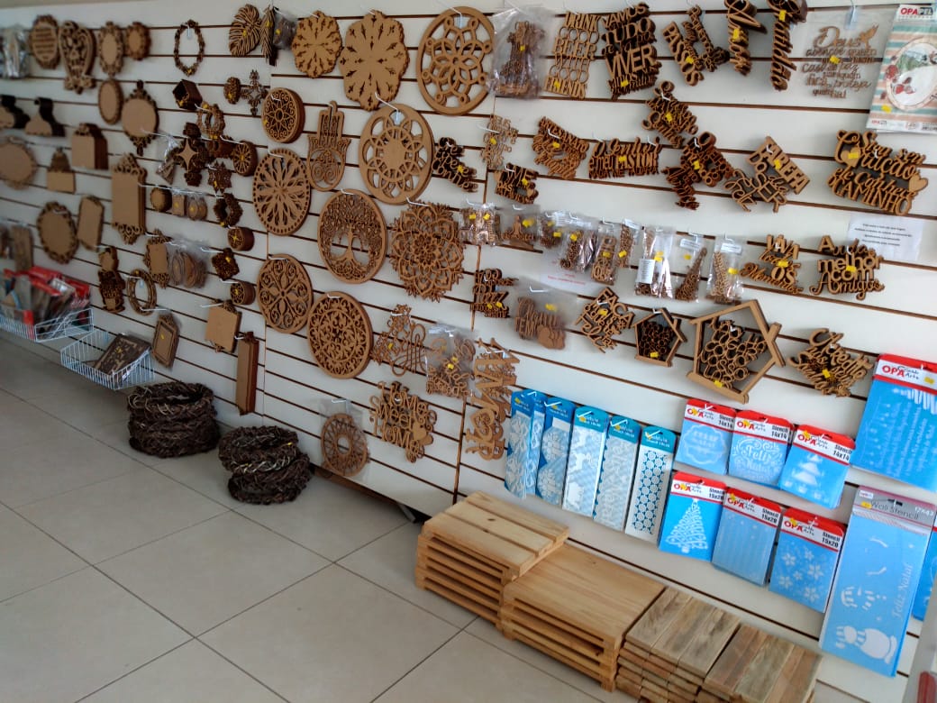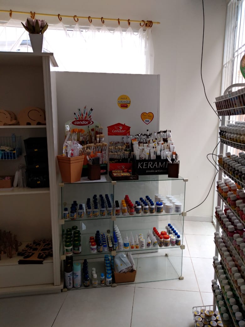Espaço destinado para artesãos, vendas de peças em MDF e material artístico. Curso de pintura.