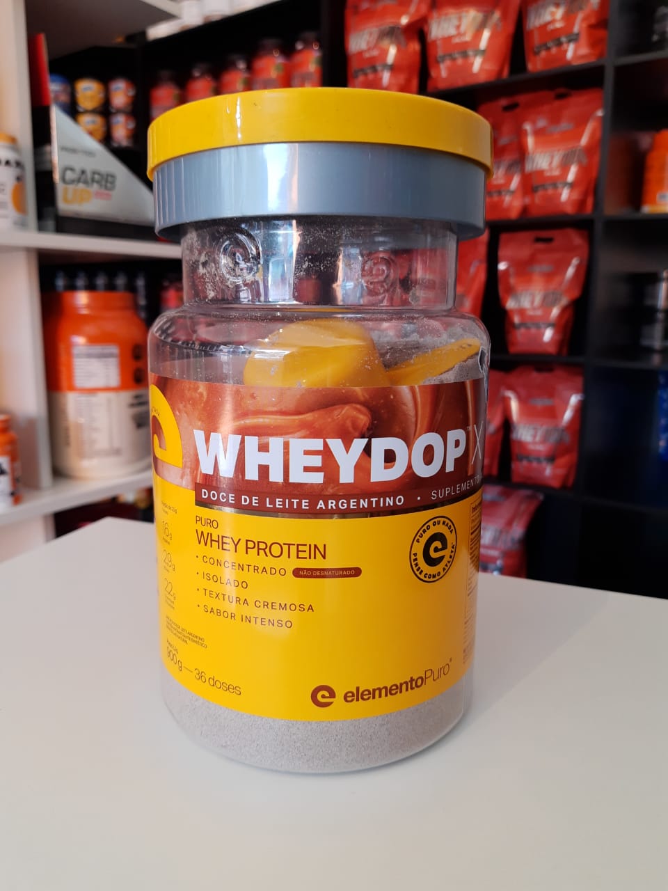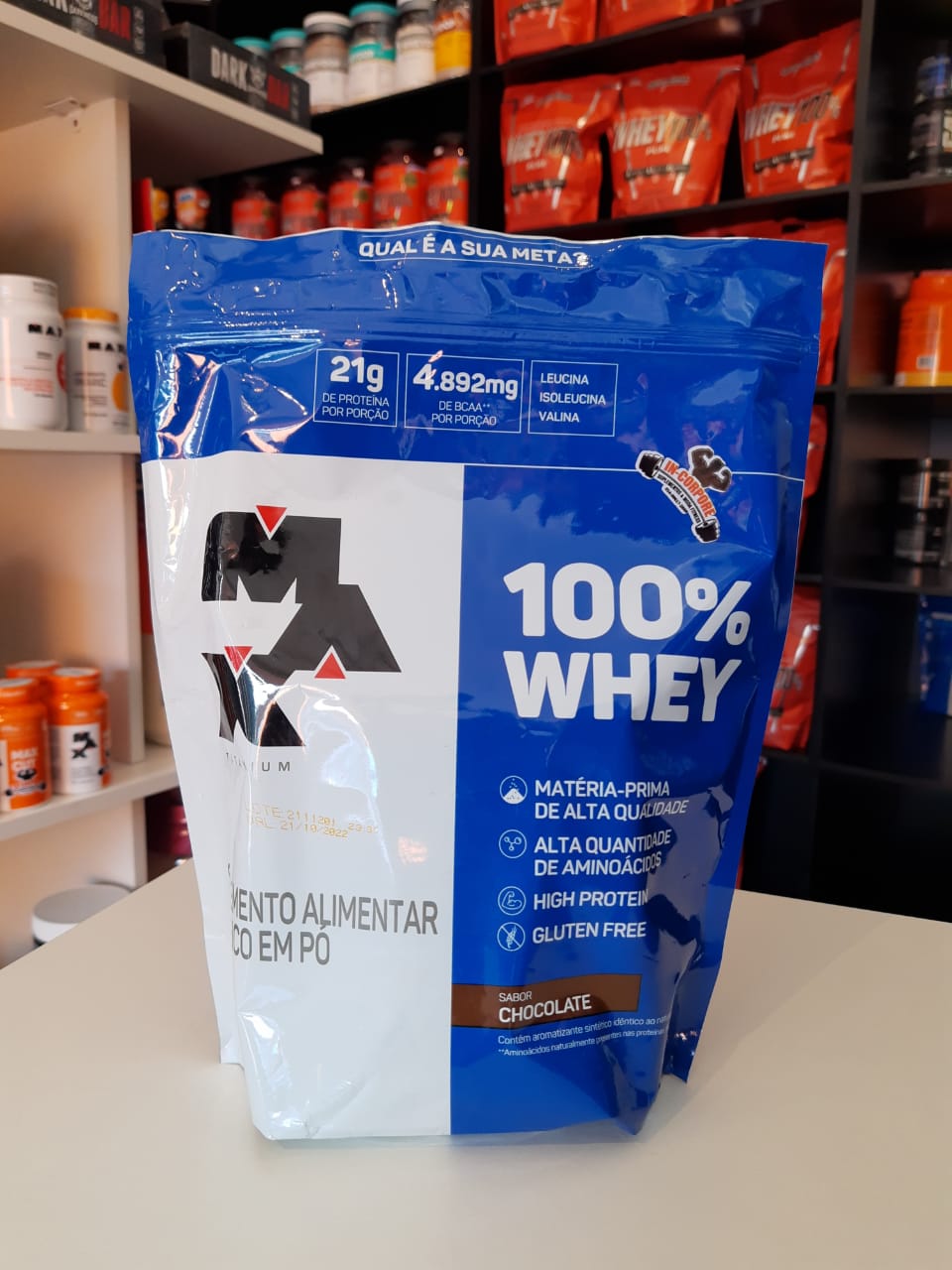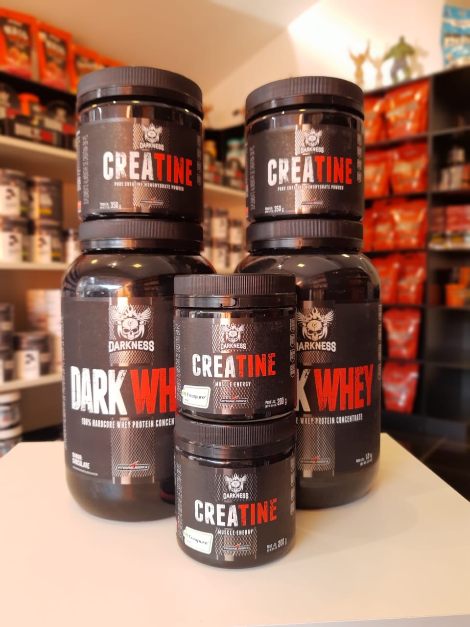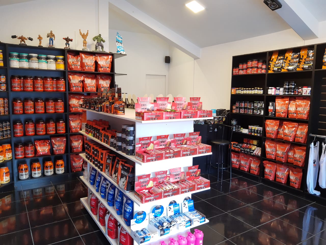 Temos: whey protein ( isolado, concentrado e hidrolisado, zero lactose, whey kult), barras de proteínas, termogênicos, barrinhas de cereais,  pasta de amendoim,  protein black, albumina, energy drink, creatinina, ômega 3, chá detox, maltodextrina, BCAA,  barrinhas whey ( dark, whey bar e power protein), além de uma linha completa de roupas fitness.