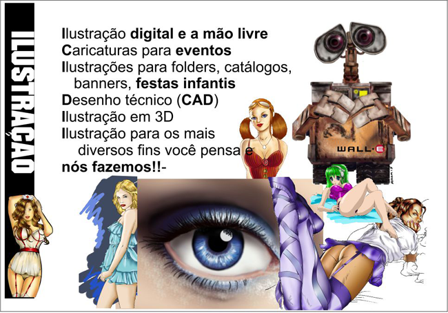- Ilustrações: para capas de livros e revistas, caricaturas para eventos, charges, historias em quadrinhos... enfim, tudo o que um desenho pode representar.