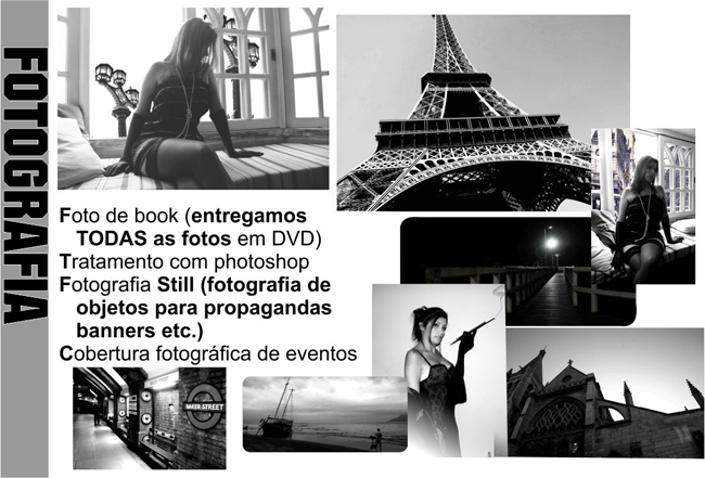 - Fotografia: cobertura de eventos, books, fotografia de objetos (still) para anúncios folder catálogos, etc.