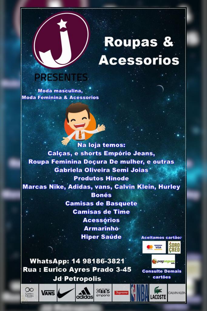 ✔A J Presentes, teve seu início no dia 05/01/2018, no começo apenas com uma loja virtual, sempre buscando as melhores opções de roupas para nossos clientes, trazendo sofisticação a um preço acessível ao bolso de todos.