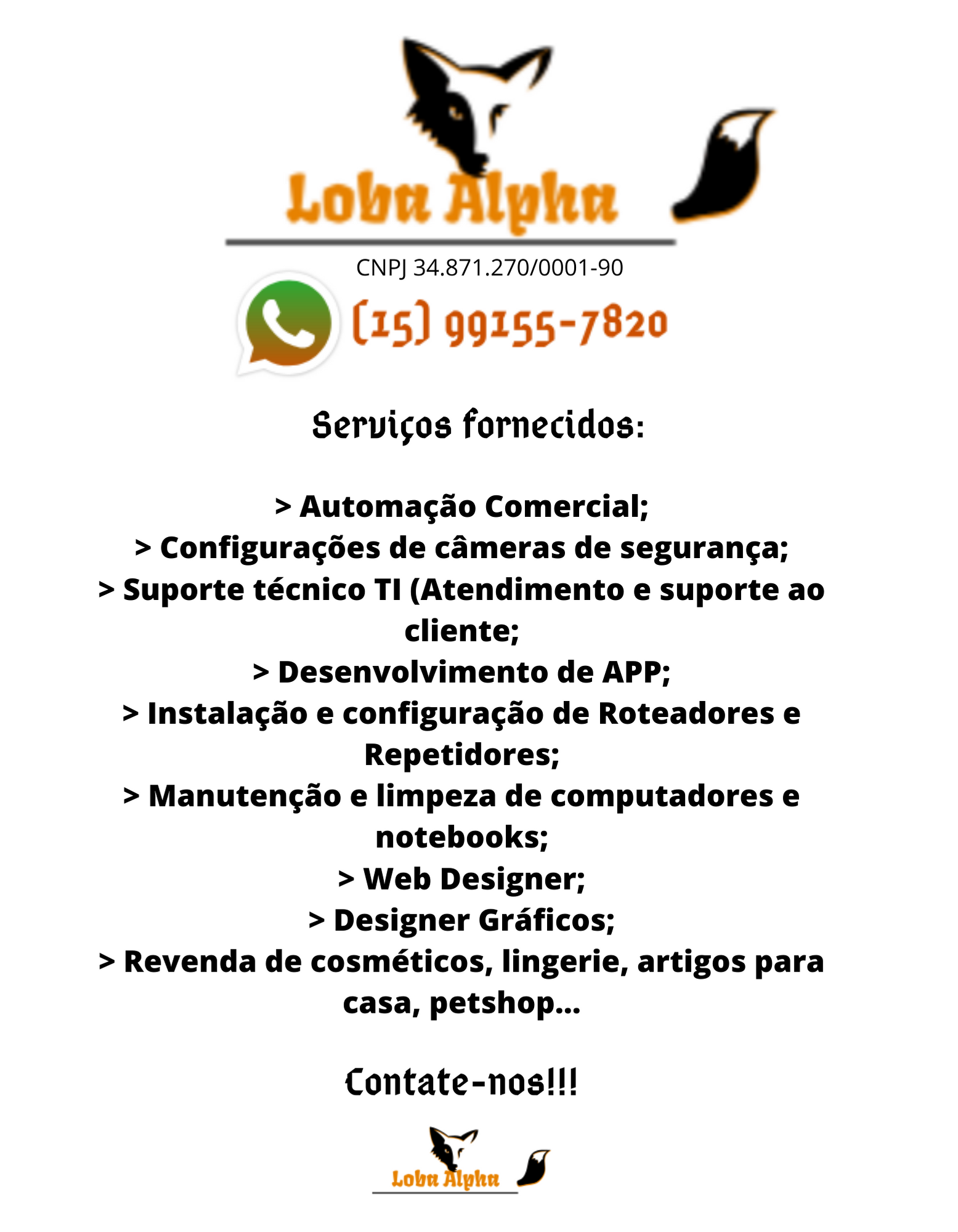 Somos uma empresa prestadora de serviços na área da informação, fornecendo serviços de: Web Designer, Designer Gráficos, Assistência Técnica a Informática (identificação de vírus, configuração e instalação de roteadores e repetidores, backup de dados, formatação de computadores, notebooks e smarthphones, identificação e correção de lentidão em smarthphones, verificação e correção de lentidão na rede de internet caseira) e Desenvolvimento de APP para Android, que pretende ser reconhecida pela solidez e competência. A nossa vontade de crescer faz com que nos desafiemos com entusiasmo e determinação a cada projeto que nos propomos.