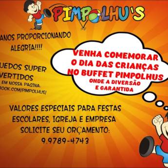 Pimpolhus Buffet Infantil há 15 anos organizando sua festa com o que há de melhor, festa completa, onde você só vem com seus convidados para comemorar, produtos de qualidade, decorações diversificadas com todas as novidades do mercado, local amplo e bem equipado, games, brinquedos, som e cardápio variado para almoço e jantar. Aceitamos todos os tipos de cartões. A diversão mais segura para seus filhos!