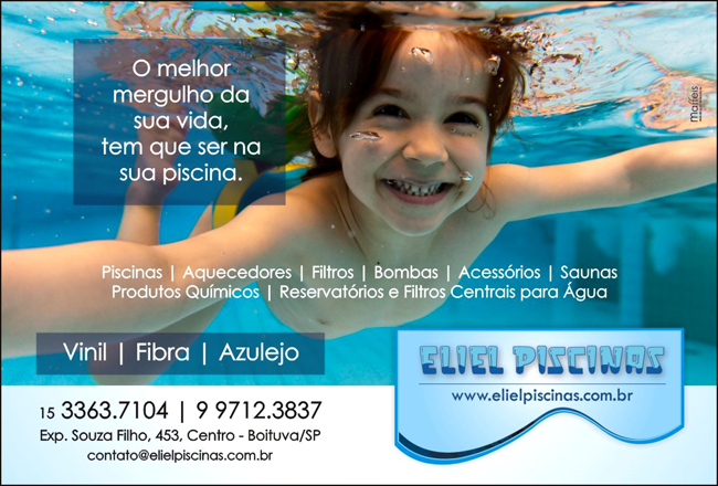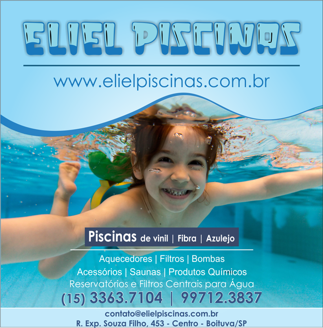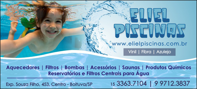 Eliel Bueno,proprietário da Eliel Piscinas, atua no ramo de piscina desde 2006.Conta agora com sua loja estabelecida,desde 2013 em Boituva.A loja tem se destacado na cidade como uma das melhores lojas no segmento de piscinas,segundo a opinião pública. Aqui você encontra piscinas em vinil, fibra e alvenaria.