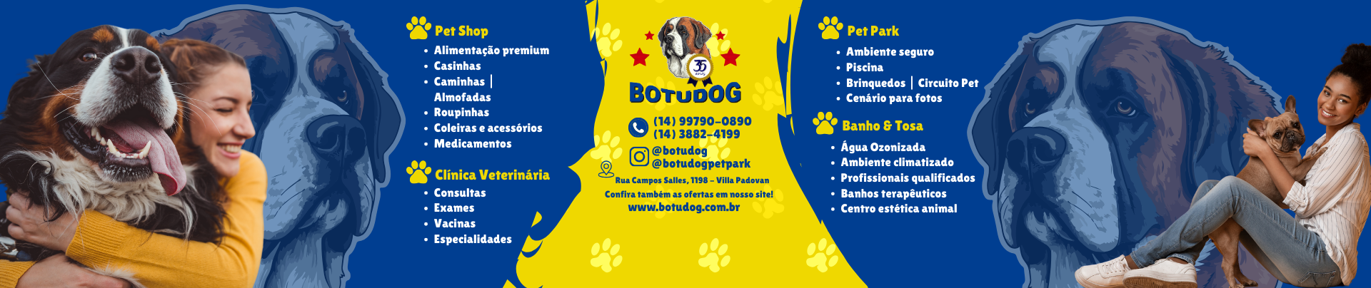Há 35 anos, nós da Botudog cuidamos da nutrição e da saúde dos seus pets com muito amor e dedicação. Aqui você encontra ração de qualidade, acessórios divertidos e medicamentos essenciais para o bem-estar do seu melhor amigo. E mais, temos também serviços de banho e tosa e consultório veterinário para deixar o seu pet ainda mais bonito e saudável.