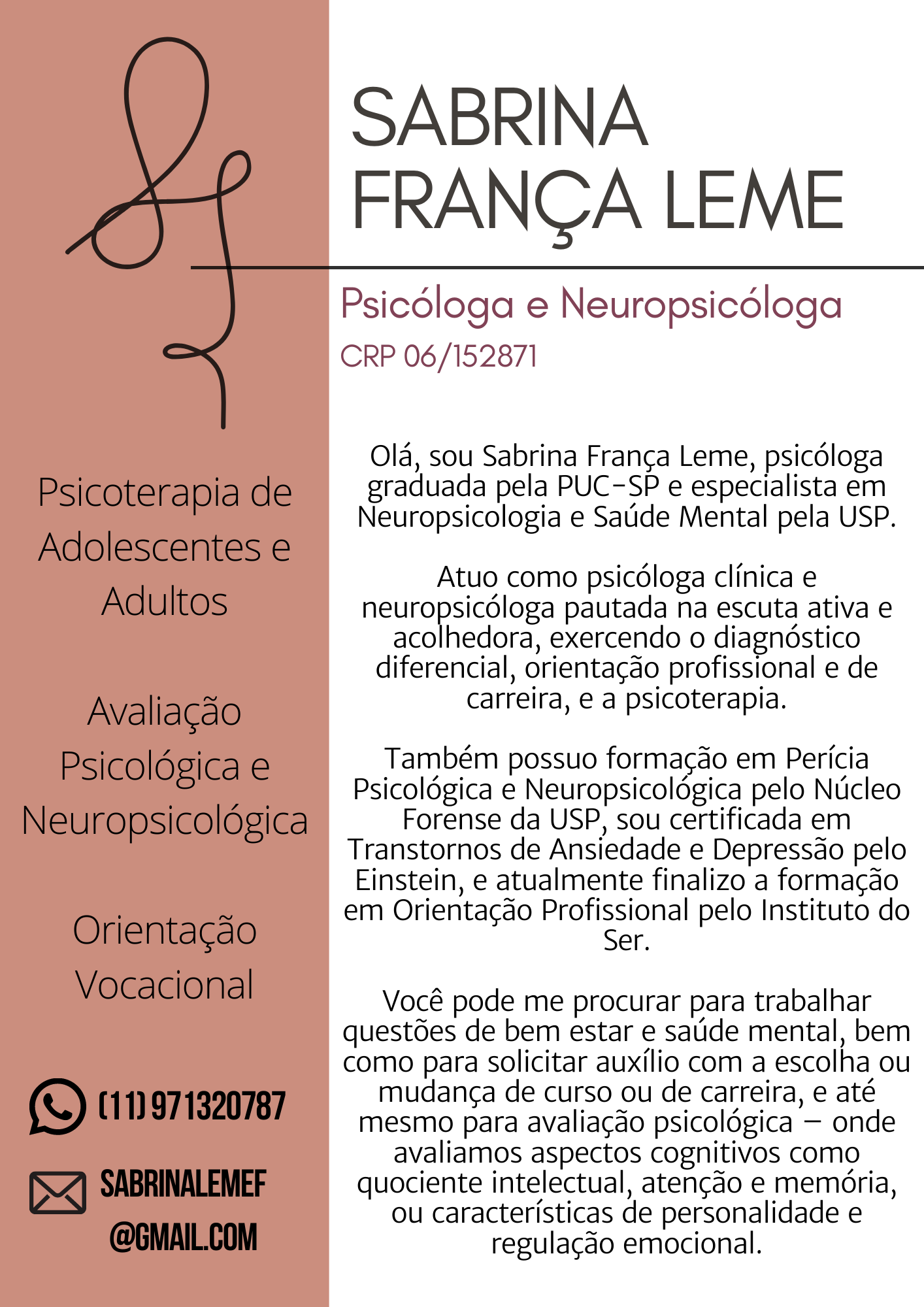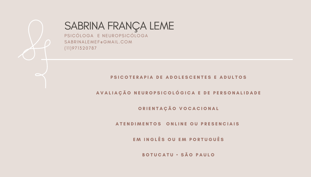 Sou Sabrina França Leme, psicóloga graduada pela PUC-SP, especialista em Neuropsicologia e Saúde Mental pela USP.