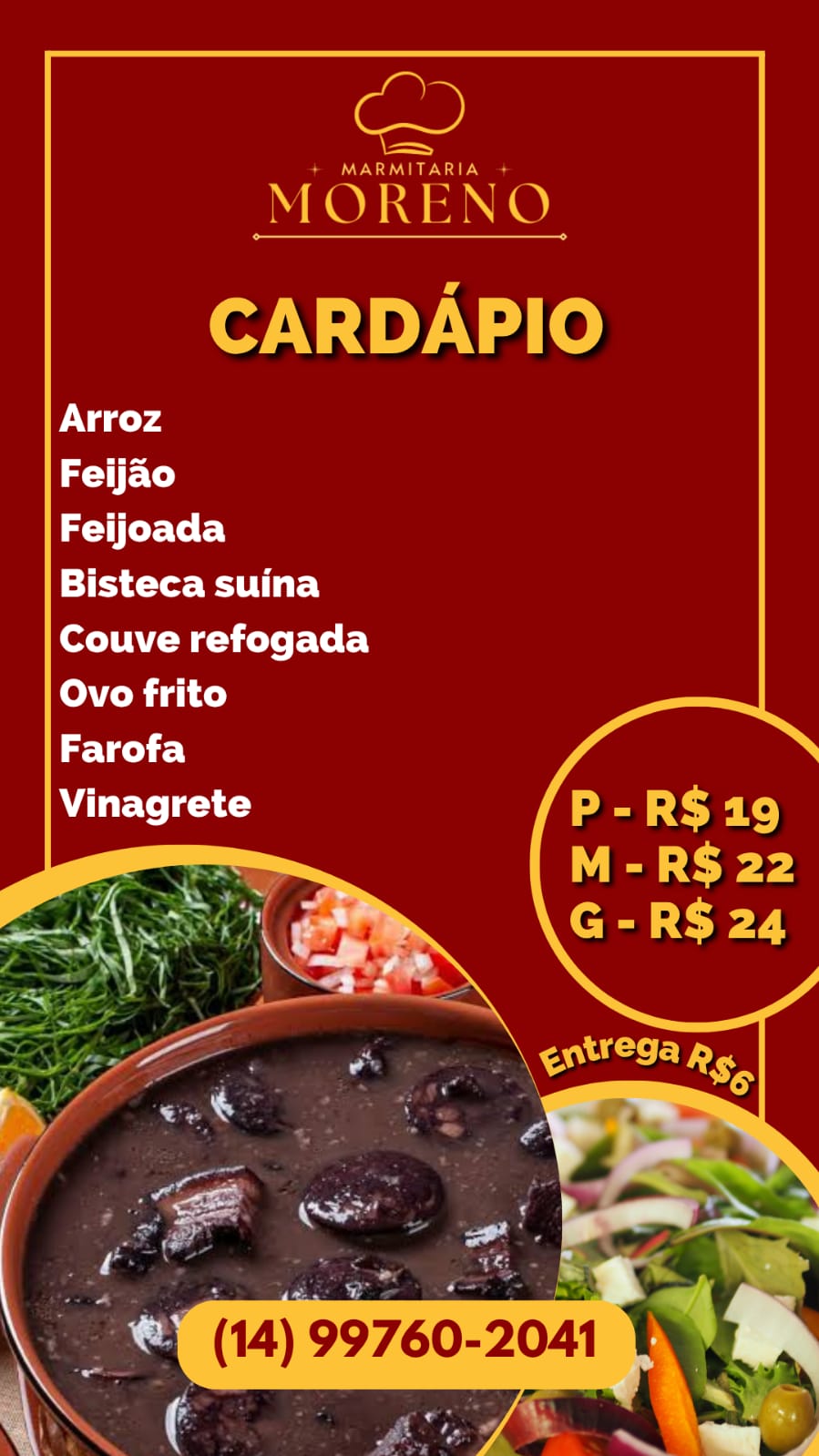 Variedade de Marmitas: Oferecemos marmitas em três tamanhos – pequena, média e grande – para atender desde quem precisa de uma refeição leve até quem busca saciar uma grande fome.