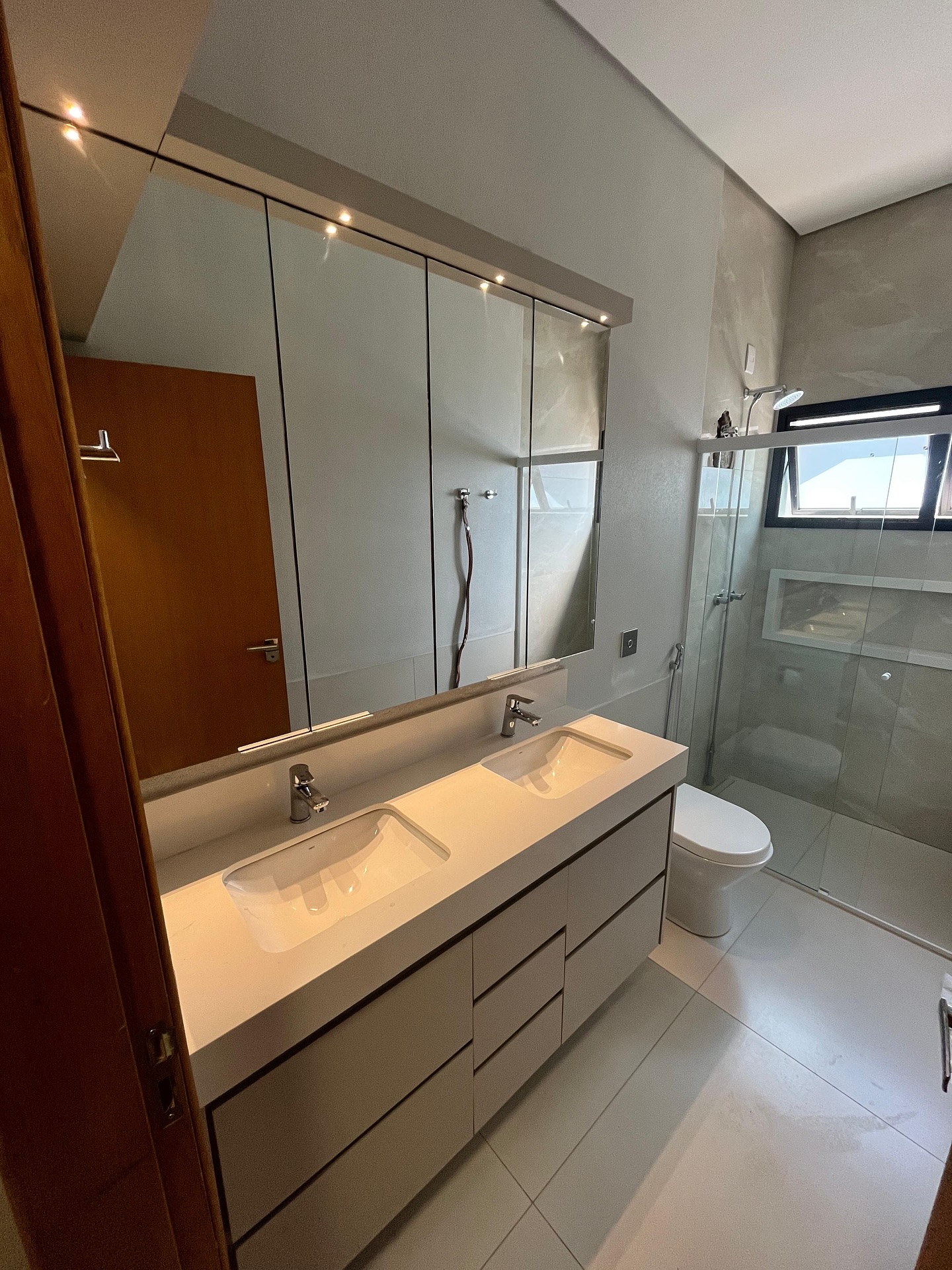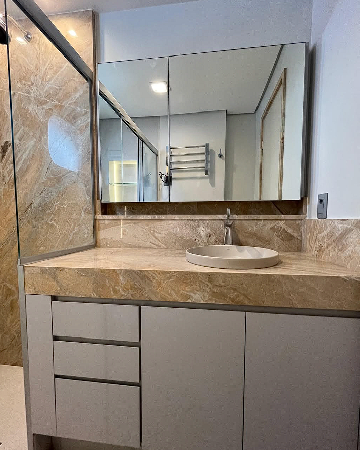 Banheiro planejado: Móveis resistentes à umidade, com designs modernos e funcionais.