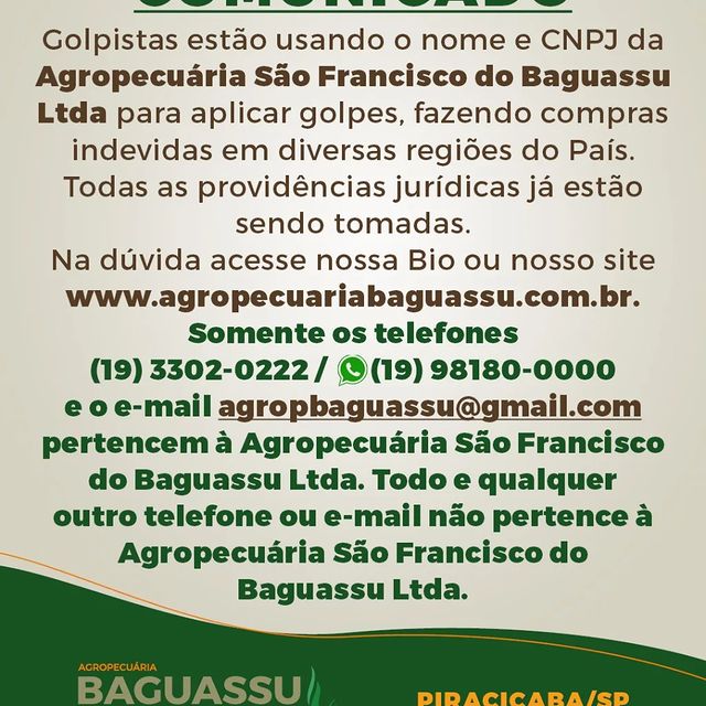 Golpistas estão usando o nome e CNPJ da Agropecuária São Francisco do Baguassu Ltda de Piracicaba/SP para aplicar golpes, fazendo compras indevidas em diversas regiões do País. Todas as providências jurídicas já estão sendo tomadas. Na dúvida acesse nosso instagram agropecuariabaguassu ou nosso site www.agropecuariabaguassu.com.br. Somente os telefones (19) 3302-0222 / (19) 98180-0000 (whatsapp) e o e-mail [email protected] pertencem à Agropecuária São Francisco do Baguassu Ltda. Todo e qualquer outro telefone ou e-mail não pertence à Agropecuária São Francisco do Baguassu Ltda.