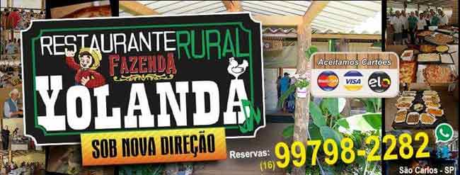 O restaurante rural FAZENDA YOLANDA veio para inovar a cidade de São Carlos na gastronomia e lazer. Comida no fogão a lenha e sobremesa. Venha saborear nossa comida típica da fazenda. Almoço servido à partir das 11:30 à 15:00. Aberto somente aos domingos.