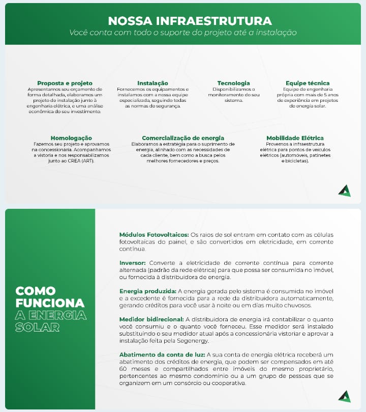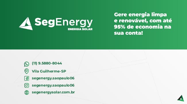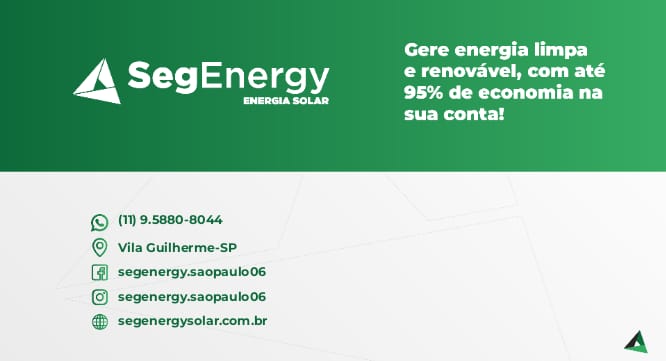 A SegEnergy é uma empresa brasileira que rapidamente se tornou sinônimo de qualidade na área de soluções integradas de energia. Hoje, somos referência no desenvolvimento, implantação e gerenciamento de soluções energéticas econômicas e ambientalmente responsáveis. A excelência na instalação do nosso sistema de energia solar é a garantia do melhor negócio para nossos clientes, valorizando a qualidade dos materiais e o melhor suporte pós venda. Nosso objetivo é a popularização da energia solar como uma opção viável, acessível e sustentável. Em apenas 1 ano de atuação, já são mais de 500 sistemas instalados em todo território nacional.