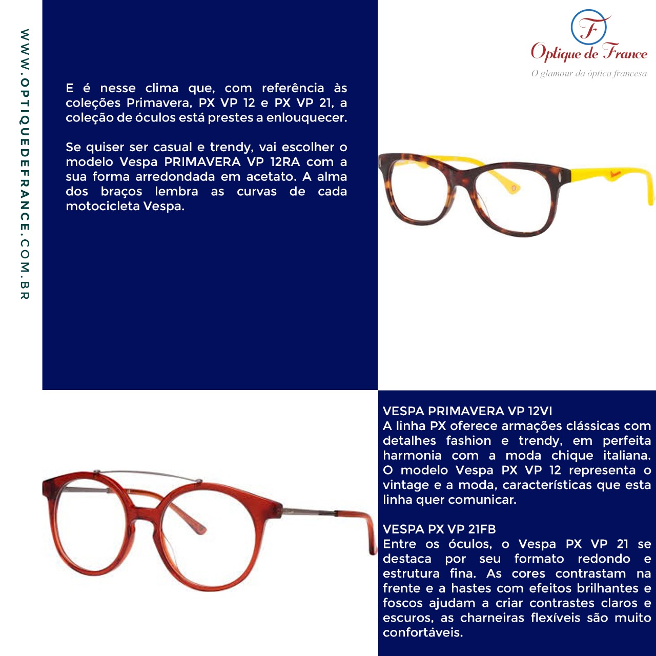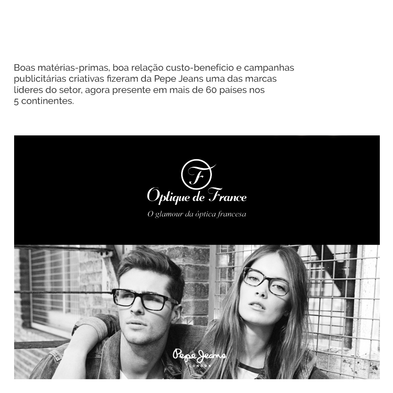 Optique de Franche é um novo conceito em óptica localizada em São Paulo, o de melhor servir o cliente em um ambiente descontraído, altamente profissional e sempre disponibilizando os melhores produtos ópticos, tanto para receituário quanto para linha de solares (Made in France). Temos o objetivo de lhe oferecer a oportunidade de realçar a sua beleza e personalidade através das mais conceituadas grifes do mundo óptico. Todos os nossos óculos são exclusivos e fabricados na França.