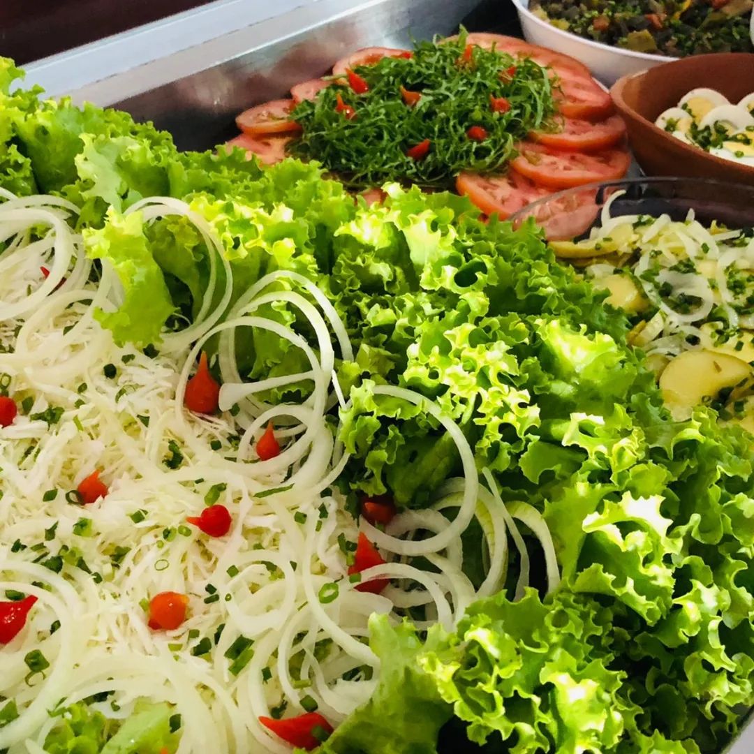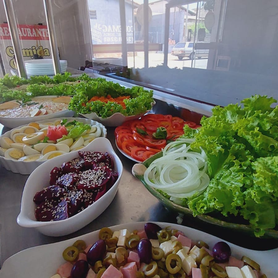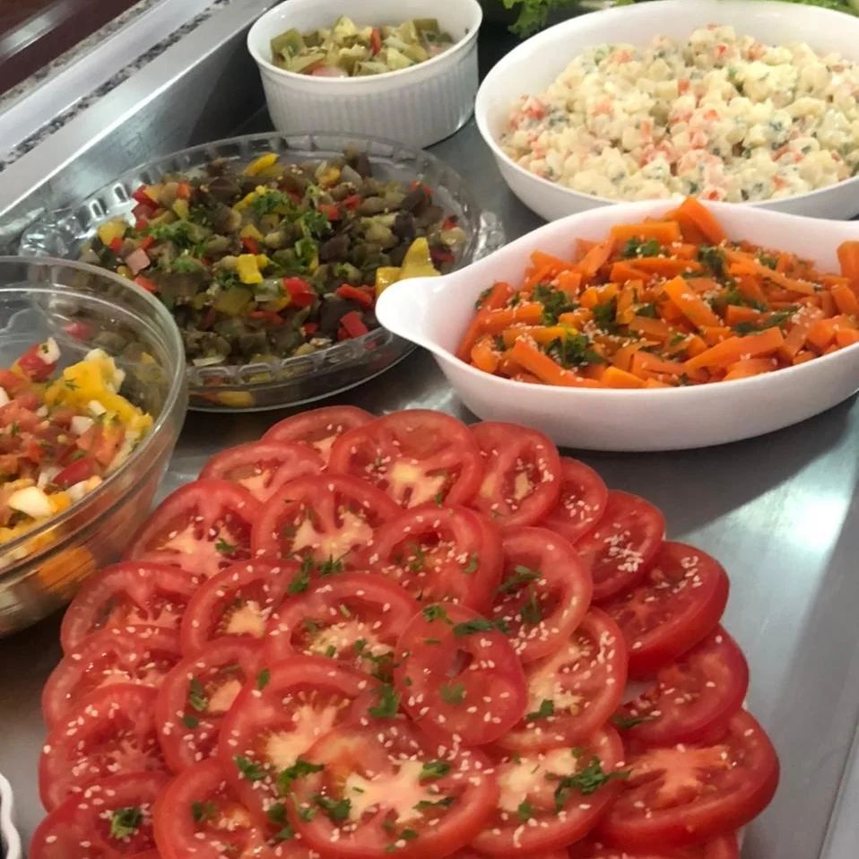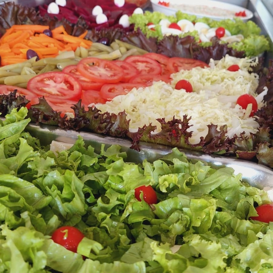 Self-service: Uma forma prática de se servir à vontade, com diversas opções de saladas, pratos quentes e acompanhamentos.