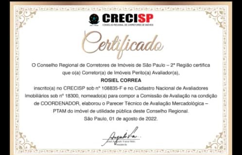 Rosiel Correa é corretor de imóveis, perito avaliador imobiliário mercadológico e também palestrante de segurança do trabalho dos corretores de imóveis e das imobiliárias em Santo André.