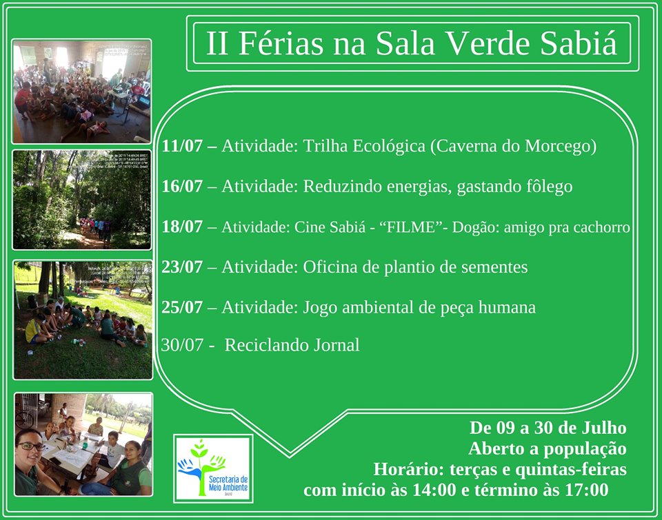 A secretaria está promovendo a programação de férias na Sala Verde "Sabiá". Um ótimo lugar para levar o(a) seu(a) filho(a)! Serão desenvolvidas várias atividades durante o dia e eles não podem perder essa oportunidade!