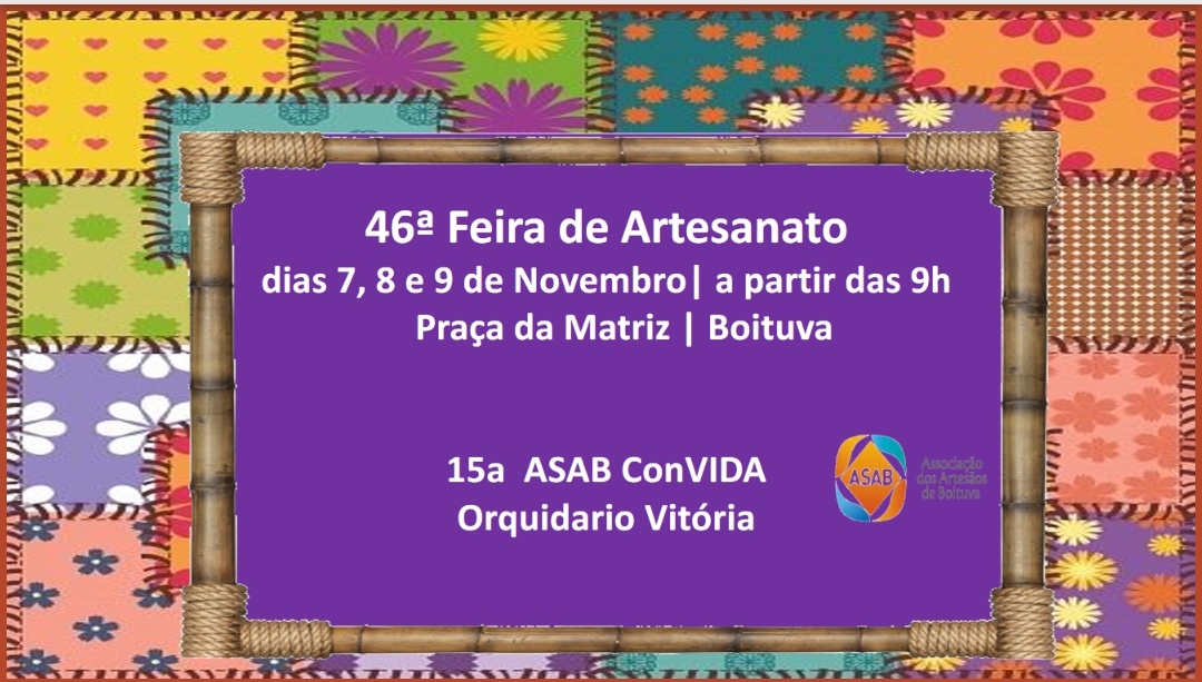Acontece nesta semana dos dias 7 a 9 a 46° Feira de Artesanato na Praça da Matriz a partir das 9h, contando também com a participação da 15° ASAS ConVIDA - Orquidário Vitória.