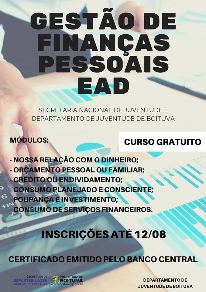 A Prefeitura de Boituva através do Departamento de Juventude em parceria com a Secretaria Nacional de Juventude oferece o Curso de Gestão de Finanças Pessoais (EAD) de forma gratuita. Para se inscrever é necessário realizar o cadastro no Sistema Nacional de Juventude (SINAJUVE) http://eadsnj.ibict.br/moodle/ e preencher este formulário https://forms.gle/ucwaQ4ShKeQ5Sc3a8