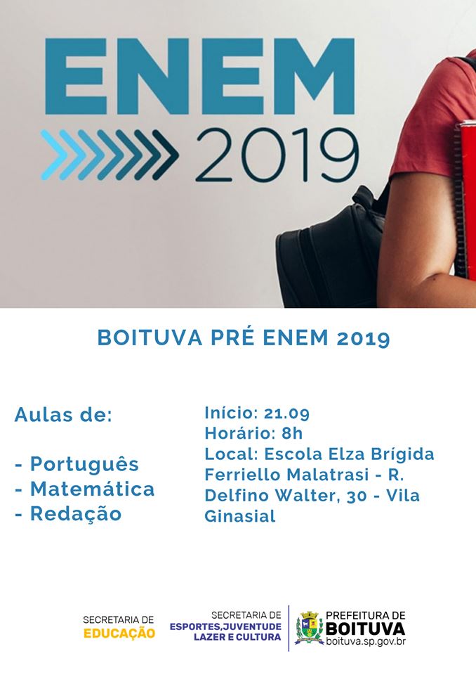 A Prefeitura de Boituva, através de uma parceria ente as secretarias de Educação e de Esportes, Juventude, Lazer e Cultura, realizará à partir do próximo sábado (21), um curso preparatório para o Enem e também para qualquer prova de concurso ou vestibular.