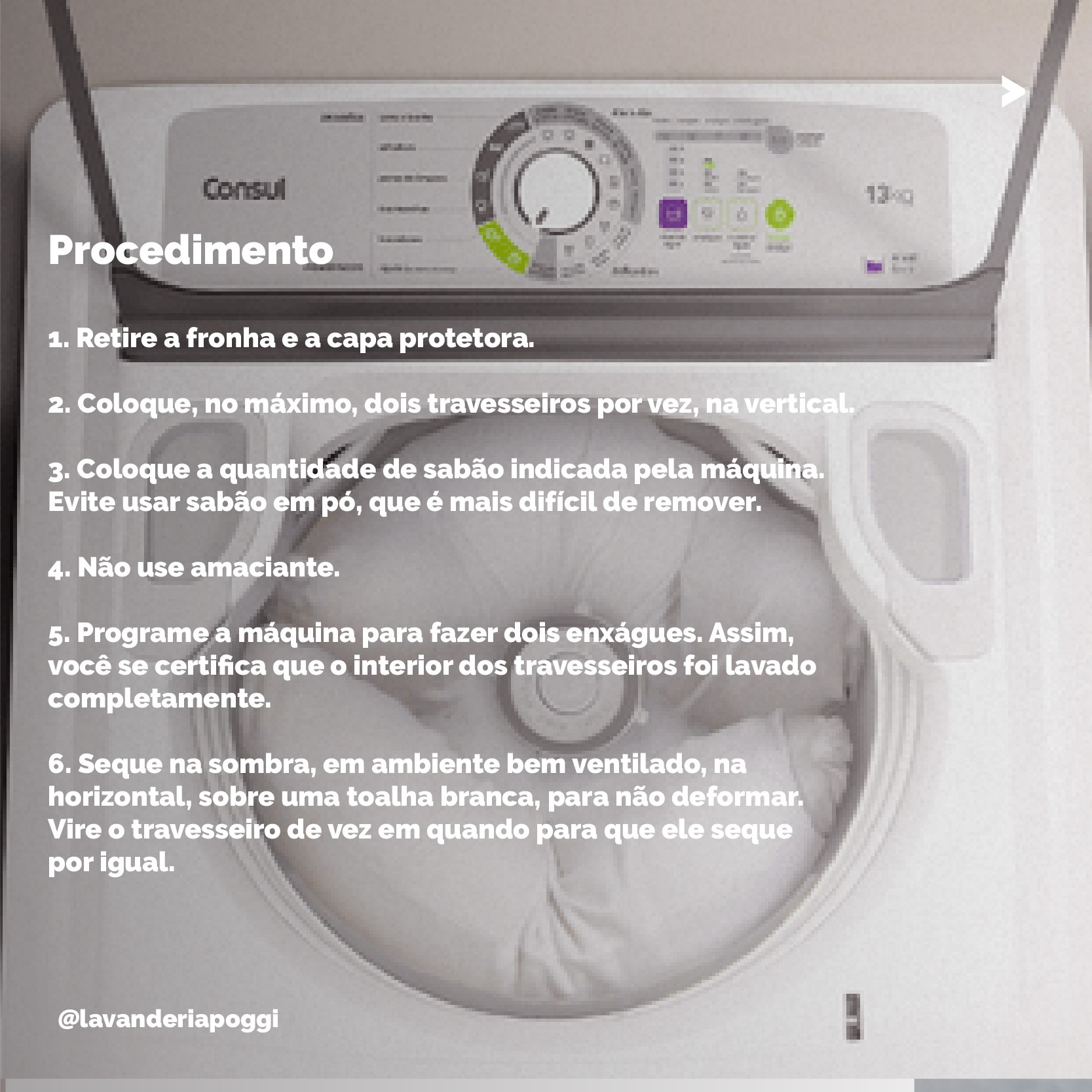 5- Programe a máquina para fazer dois enxágues. Assim, você se certifica que o interior dos travesseiros foi lavado completamente;