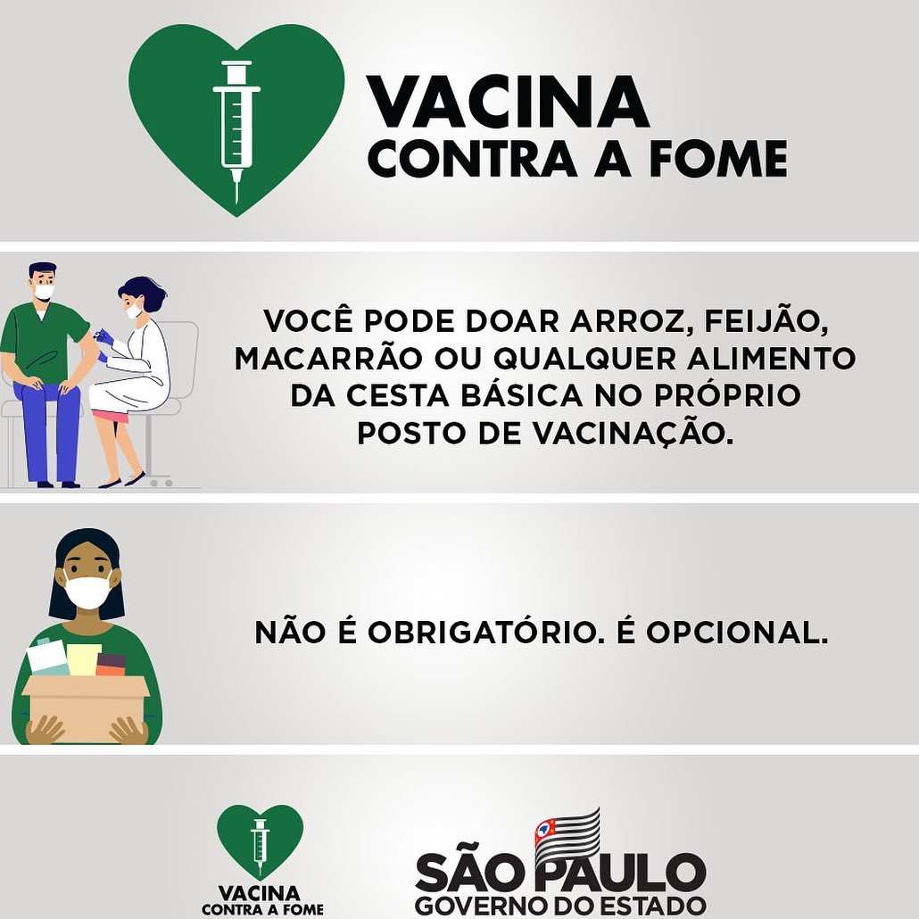 A pessoa que se encaixar nas idades acima mencionadas, pode ir ao drive-thru diretamente no dia da sua faixa-etária. Lembrando que em qualquer dia que você for vacinar, você pode colaborar com a Campanha Vacina Contra a Fome, doando alimentos para as famílias que mais precisam.