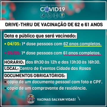 05/05 (quarta): 1ª dose pessoas com 61 anos completos.