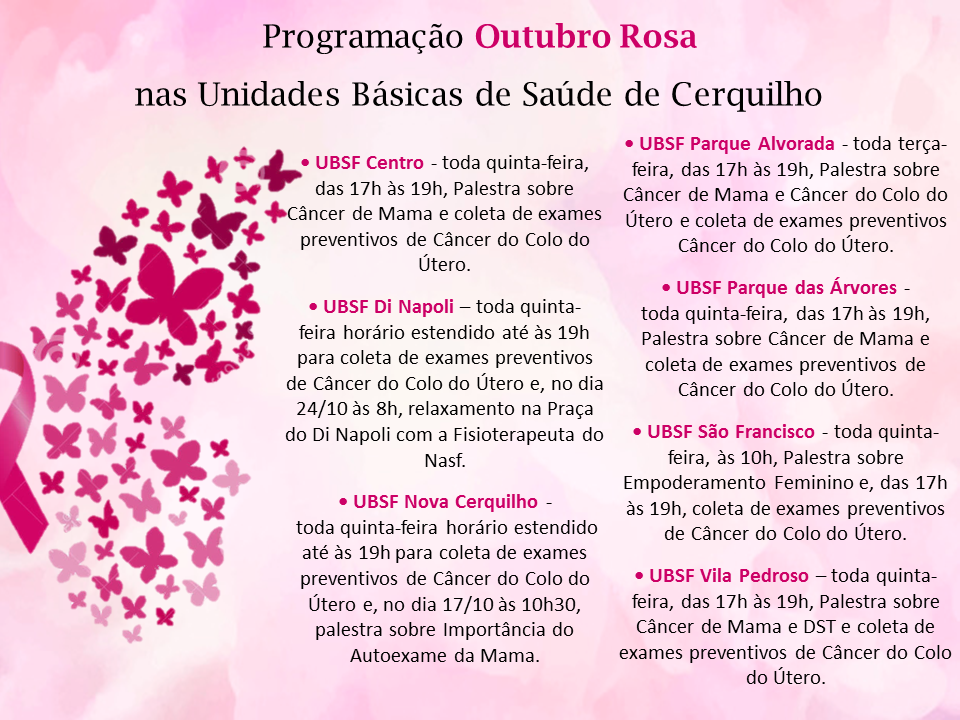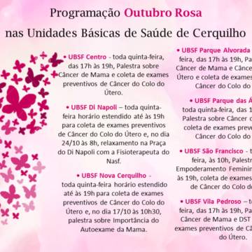 • UBSF Nova Cerquilho - toda quinta-feira horário estendido até às 19h para coleta de exames preventivos de Câncer do Colo do Útero e, no dia 17/10 às 10h30, palestra sobre Importância do Autoexame da Mama.