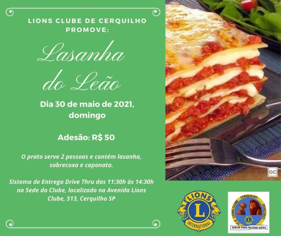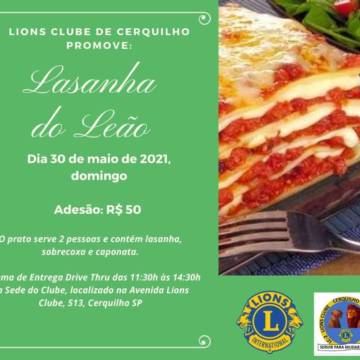 Lions Clube de Cerquilho realiza a Lasanha do Leão em prol dos que mais precisam. O valor de adesão é R$50,00 e o prato serve duas pessoas e contém lasanha, sobrecoxa e caponata.