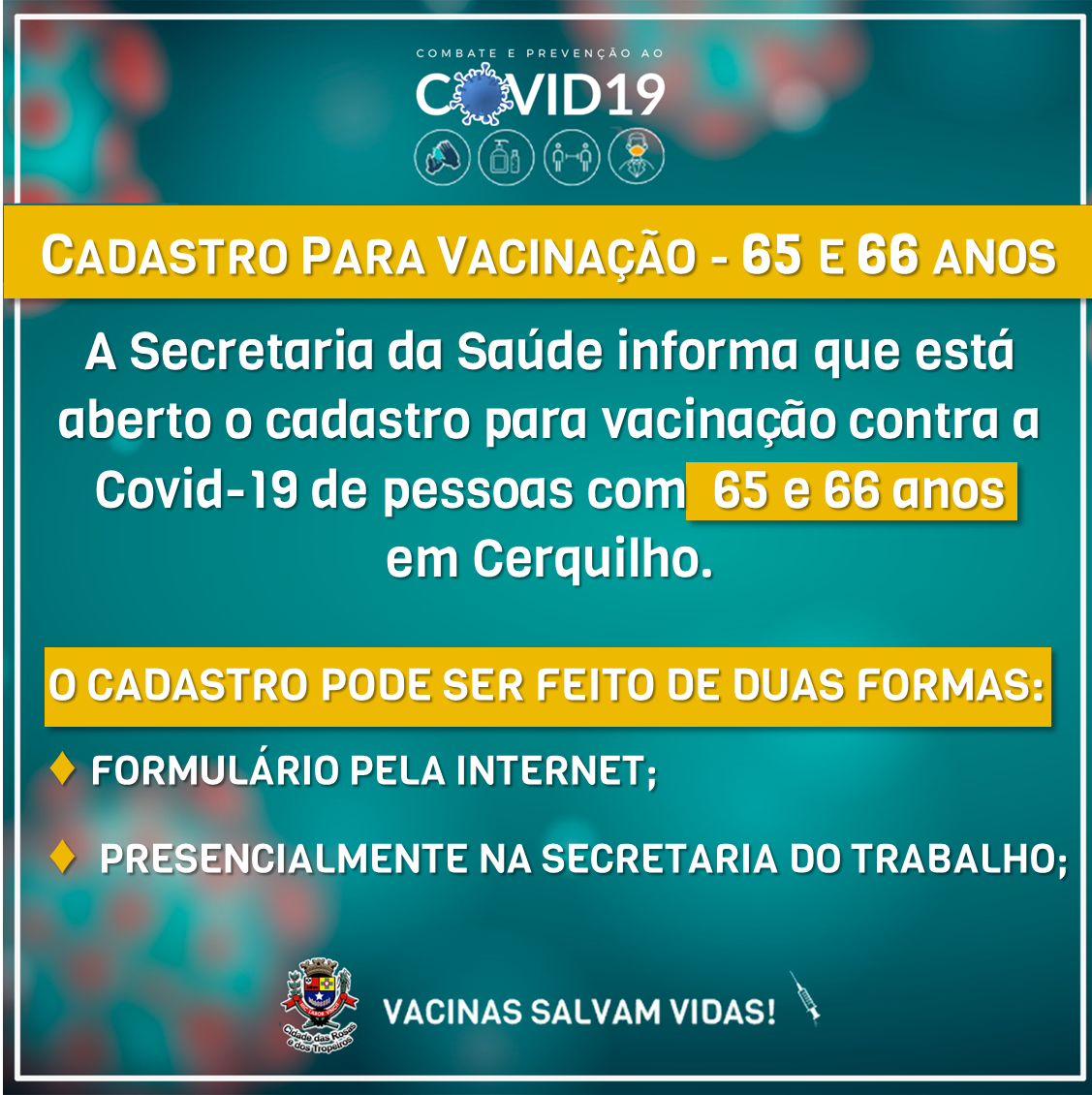 A Prefeitura de Cerquilho informou a população que está aberto o cadastro para idosos de 65 e 66 anos.
