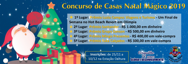 A Prefeitura Municipal de Cerquilho realiza, de 25 de novembro a 06 de Janeiro, ais um Concurso de Casas Natal Mágico 2019, que tem por objetivo resgatar todo espírito natalino, estimulando os cerquilhenses a enfeitar suas casas.
