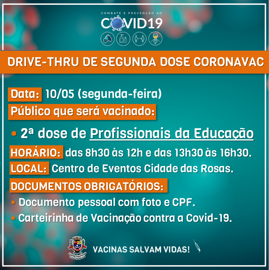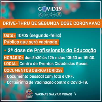 Será aplicada a segunda dose da CoronaVac aos profissionais da Educação. Os documentos obirgatórios são: