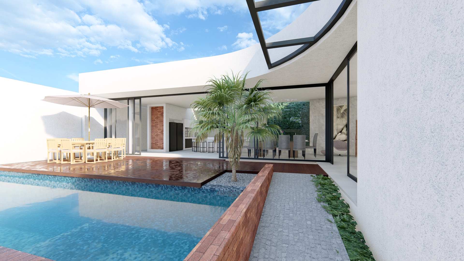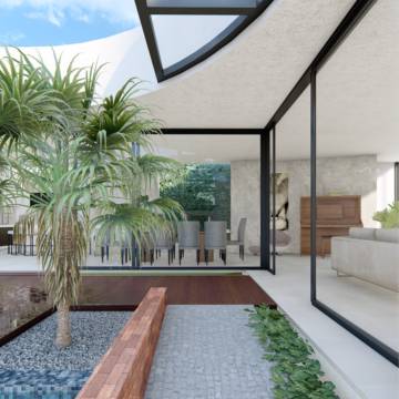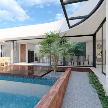 Com linhas retas, volumes marcantes e integração total entre os ambientes, o projeto da Residência Alex Rodrigues expressa o estilo contemporâneo característico da TX Engenharia. A combinação de tijolos aparentes, madeira natural e grandes aberturas cria uma estética acolhedora e sofisticada. O espaço gourmet e a piscina se conectam de forma fluida à área social, traduzindo o propósito da empresa: transformar projetos em experiências de vida.